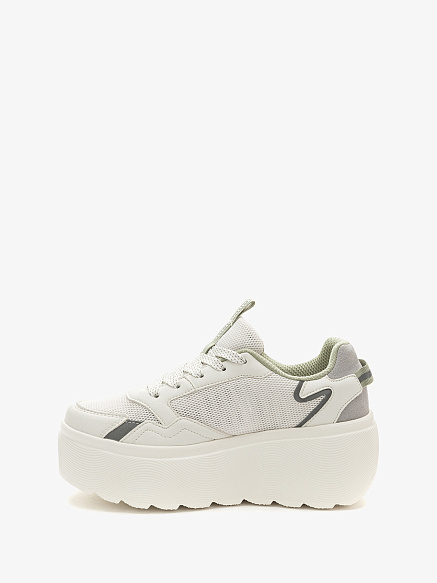 Модные женские полуботинки на высокой платформе понравятся тем, кто любит быть в центре внимания. Модель из инновационного микрополитекса и текстиля цвета топленого молока украшена серыми вставками и дополнена амортизирующей подошвой.