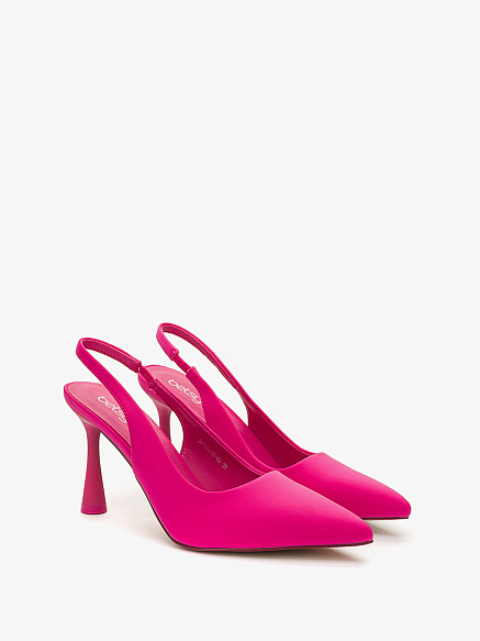 В этих ярких соблазнительных туфлях-слингбэках вы точно окажетесь в центре внимания. Модель с закрытым острым носом и открытой пяткой выполнена из текстиля цвета фуксии. Износостойкая подошва обладает оптимальным сцеплением с поверхностью. Эластичный ремешок на щиколотке и высокий каблук-рюмка завершают образ.